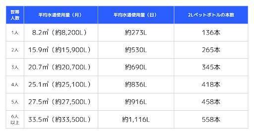 東京都水道局の調査によると、世帯人数ごとの月平均水道使用量は以下の表に記載されています。
